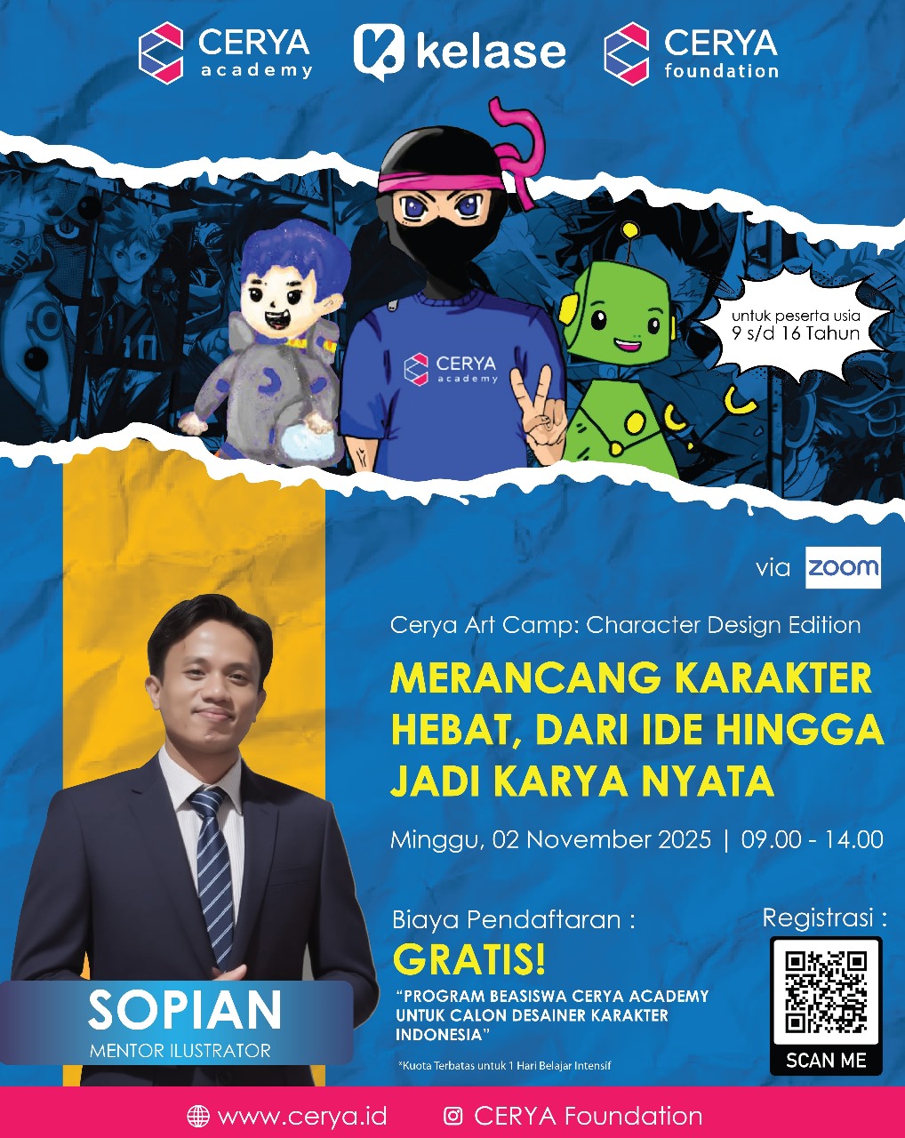 Jakarta, 02 November 2025 – Cerya Academy, Kelase, dan Cerya Foundation dengan bangga melaporkan keberhasilan pelaksanaan Cerya Art Camp: Character Design Edition yang diselenggarakan pada hari Minggu, 02 November 2025. Program ini merupakan bagian dari inisiatif Program Beasiswa Cerya Foundation Untuk Talenta Indonesia Kreatif (PUTIK) sebuah komitmen untuk memperkuat ekosistem industri kreatif nasional melalui pengembangan talenta usia dini.