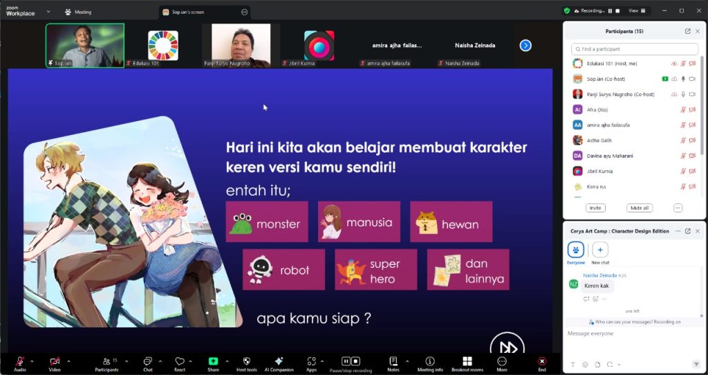 Program pelatihan intensif daring ini mengusung tema “Merancang Karakter Hebat, dari Ide Hingga Jadi Karya Nyata”. Kegiatan berlangsung selama empat jam (09.00 – 13.00 WIB) melalui platform Zoom, difokuskan untuk memberikan keterampilan praktis dan konseptual dalam desain karakter digital.