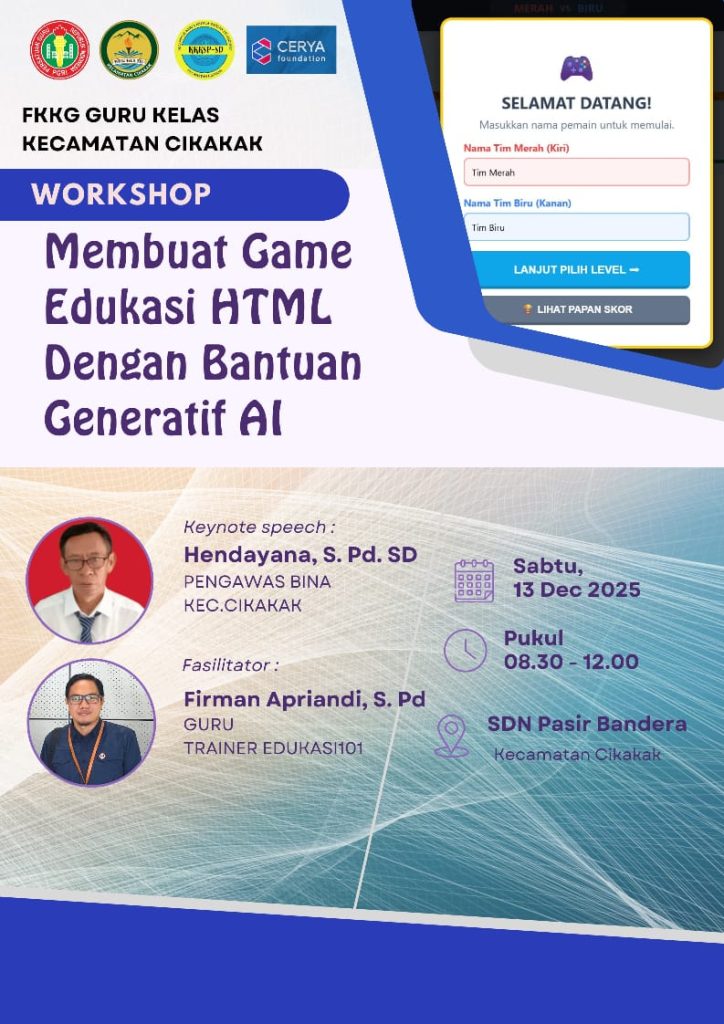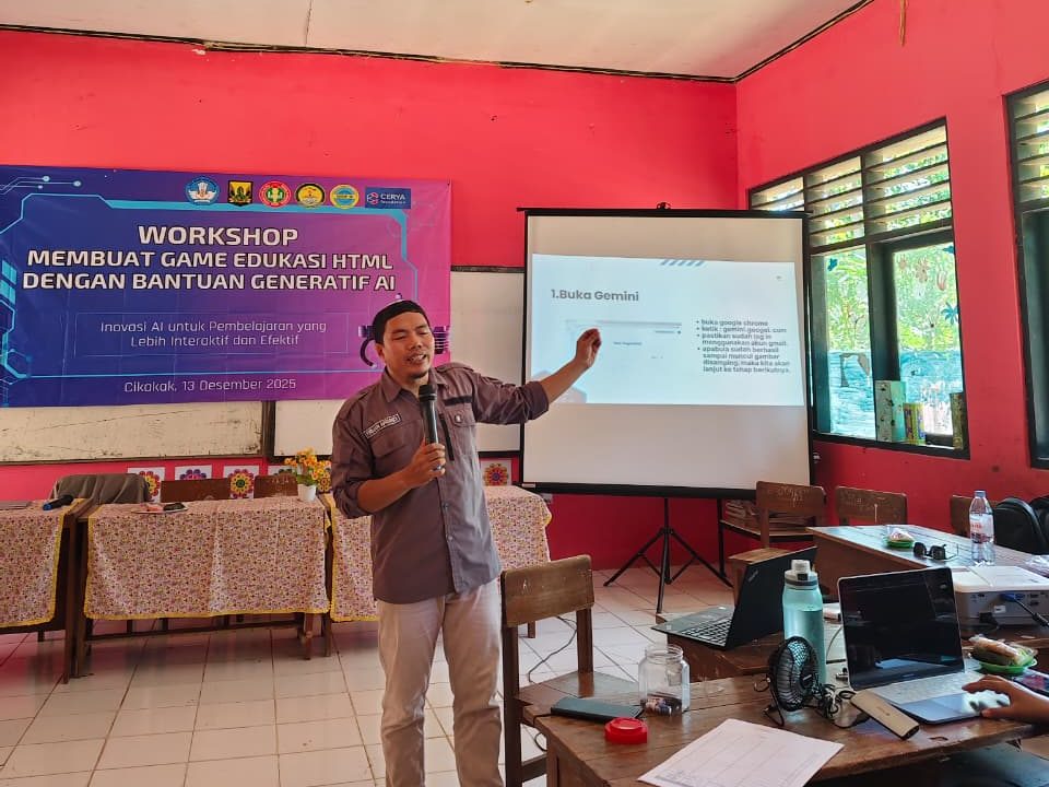 Upaya memperkuat kesiapan guru dalam menghadapi pembelajaran berbasis teknologi digital terus dilakukan di berbagai daerah. Salah satunya melalui kegiatan Workshop Membuat Game Edukasi HTML dengan Bantuan Generatif AI yang diselenggarakan oleh Kelompok Kerja Guru (KKG) Guru Kelas Kecamatan Cikakak dengan dukungan dari Cerya Foundation pada Sabtu, 13 Desember 2025. Kegiatan ini menjadi ruang belajar bersama bagi para guru untuk mengenal dan mempraktikkan pendekatan pembelajaran yang lebih kreatif dan relevan dengan kebutuhan siswa masa kini.