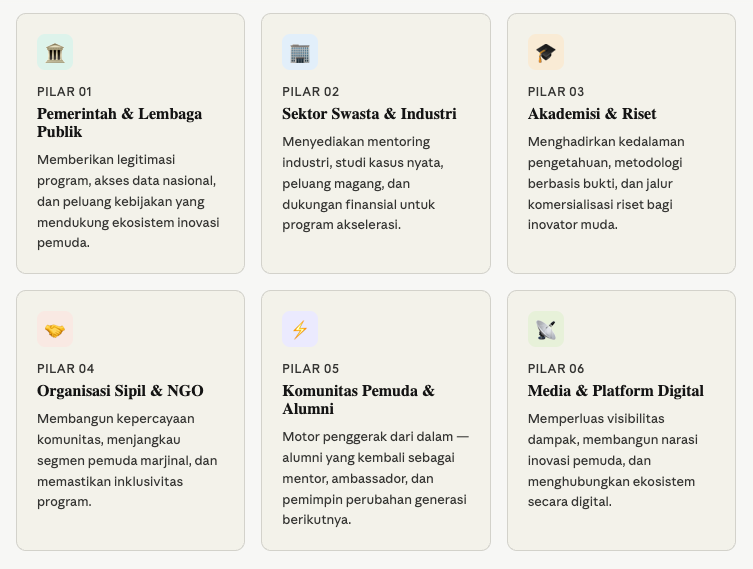 Menyiapkan inovator muda bukan hanya soal pelatihan teknis. Ini menyangkut pembentukan pola pikir, akses terhadap sumber daya, koneksi dengan mentor berpengalaman, dukungan kebijakan, serta ruang aman untuk bereksperimen dan gagal. Tidak ada satu lembaga, sekuat apapun, yang dapat menyediakan semua komponen ini sendirian.