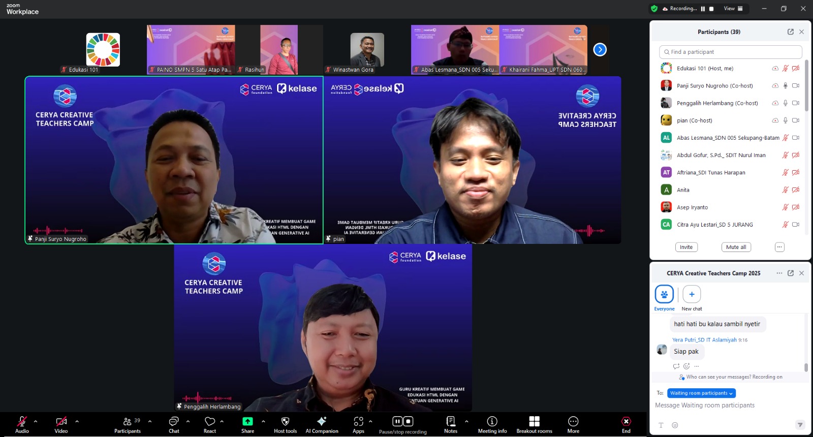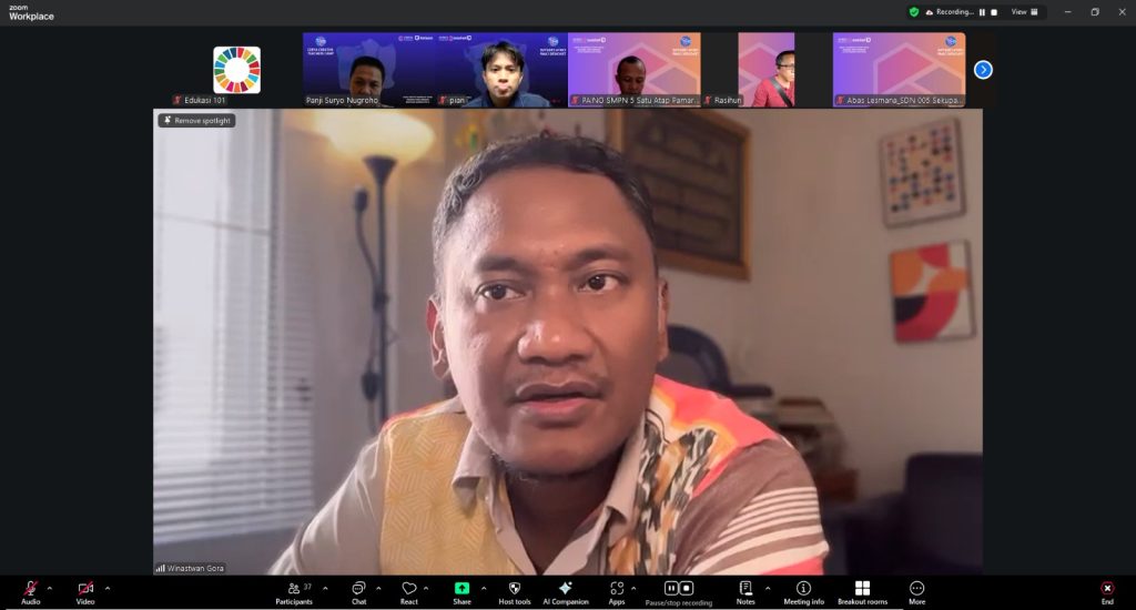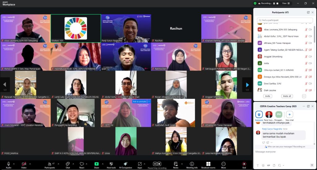 Kegiatan ini dibuka oleh Winastwan Gora, selaku Chairman of Governing Board CErYA Foundation. Sejak sesi pembuka, suasana pelatihan terasa hangat dan penuh energi. Guru-guru dari ujung timur hingga barat nusantara saling menyapa di ruang maya, berbagi pengalaman, dan bergembira menemukan banyak kesamaan tantangan dalam mengajar. Interaksi yang akrab membuat proses belajar berjalan cair, dan ruang pelatihan cepat berubah menjadi tempat kolaborasi yang hidup.
