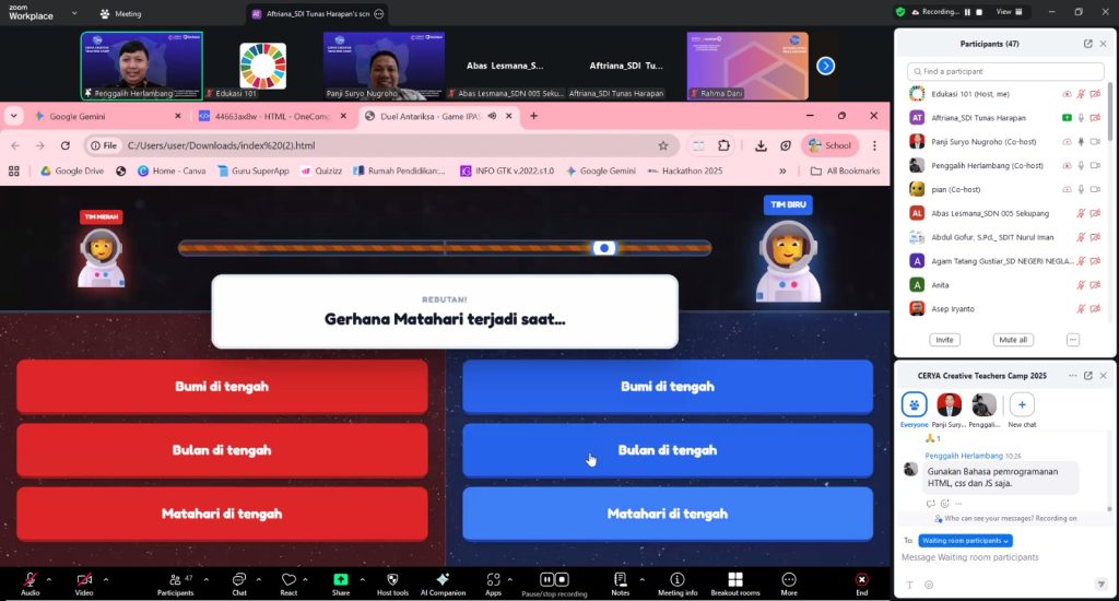 Melalui sinergi strategis, CERYA Foundation melalui Program Beasiswa Teman Guru berhasil memfasilitasi pelatihan daring intensif selama satu hari penuh. Sebanyak 44 Guru dan Tenaga Kependidikan Tingkat Sekolah Dasar dari seluruh penjuru Indonesia berkumpul secara online pada hari Minggu, 30 November 2025 untuk mengakselerasi kecakapan digital dan pedagogis mereka. Pelatihan ini difasilitasi oleh dr. Penggalih M, M.Kom praktisi edutech dan dosen UNWAHAS.